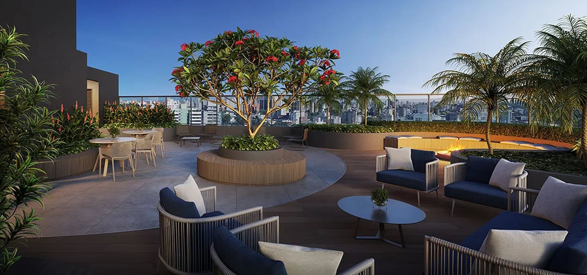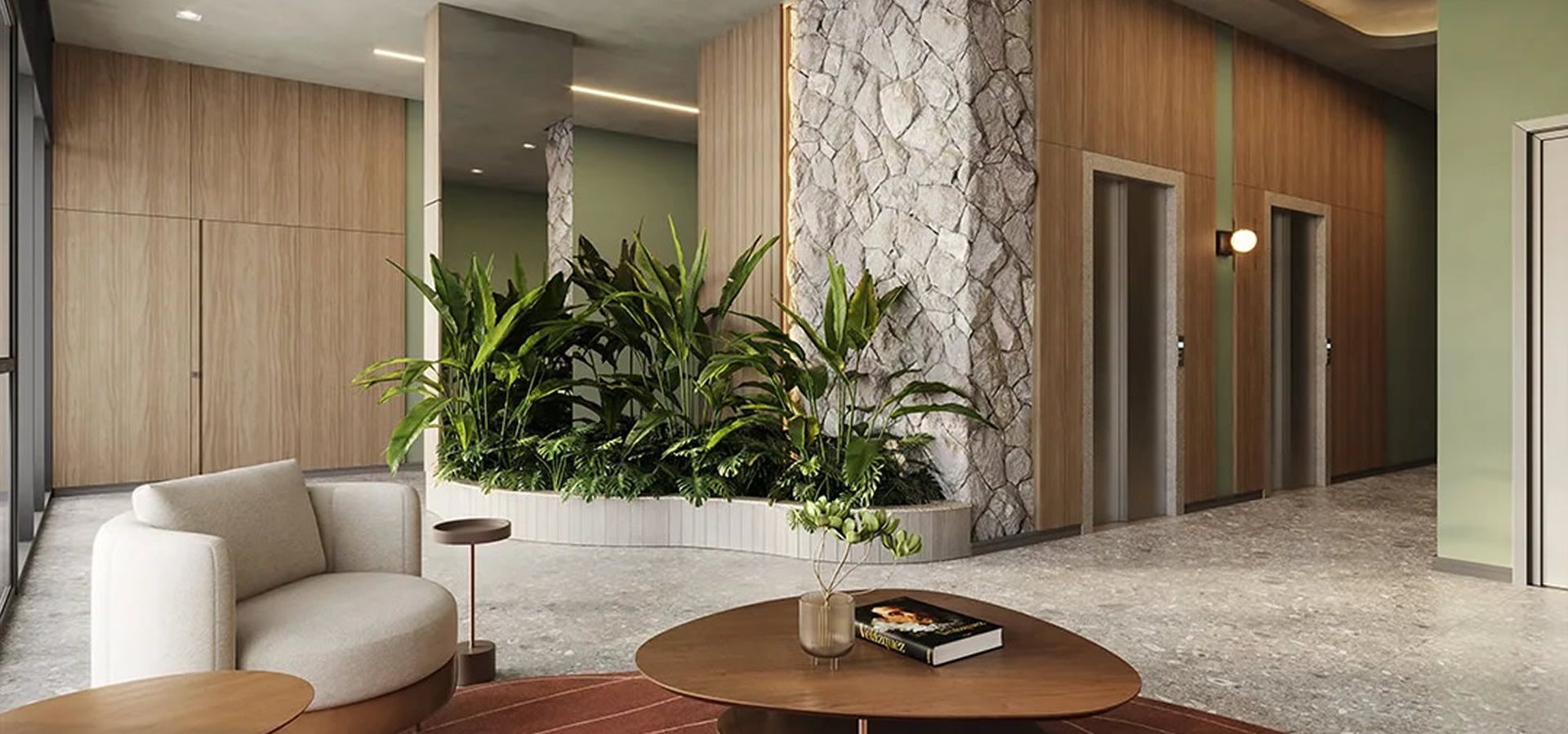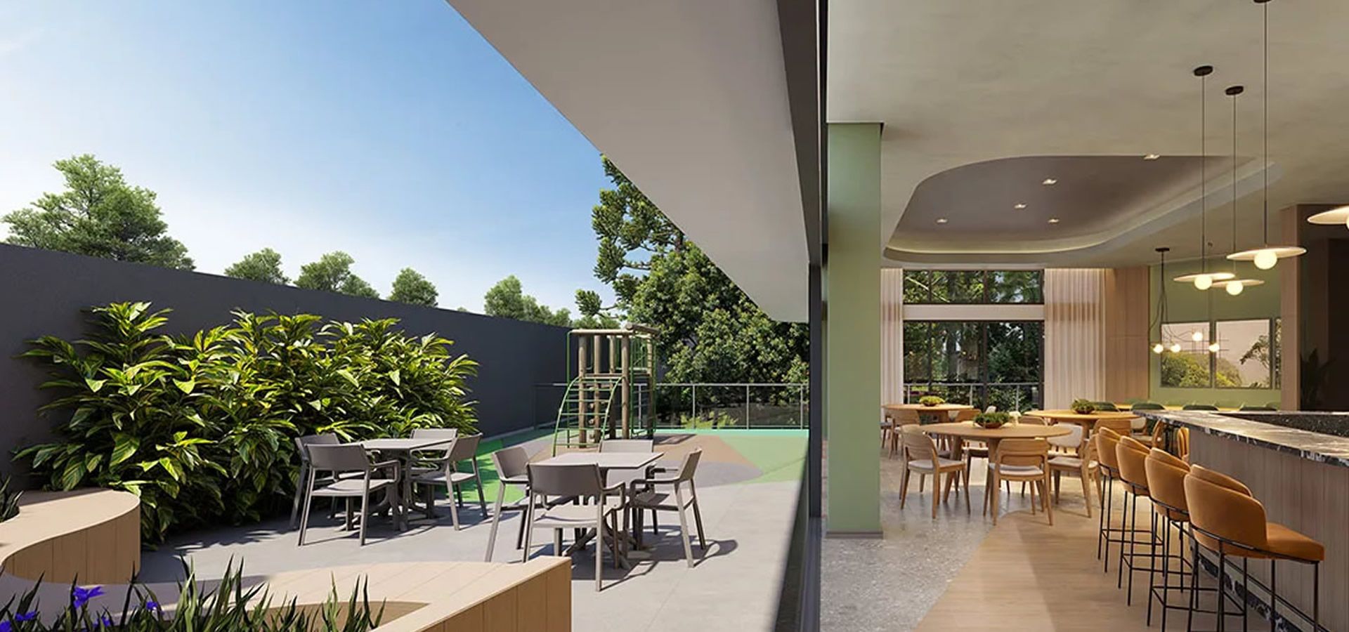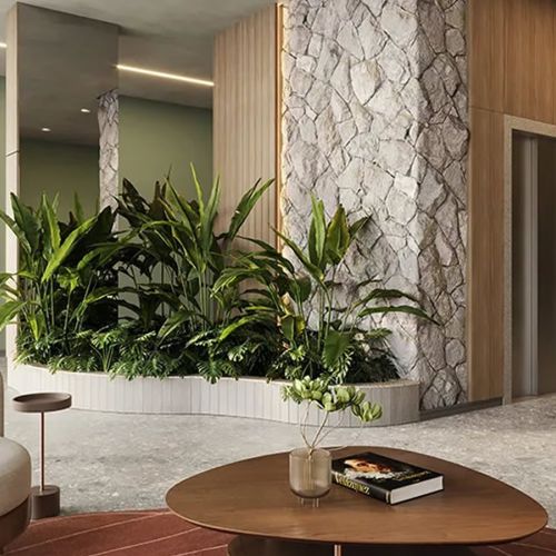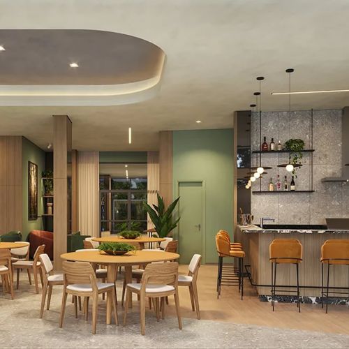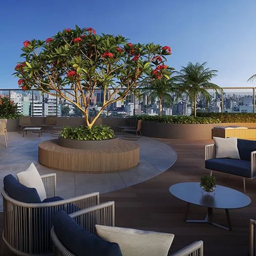 - Espaços restauradores e acesso à natureza em ambientes como rooftop, espaço convívio e solário.