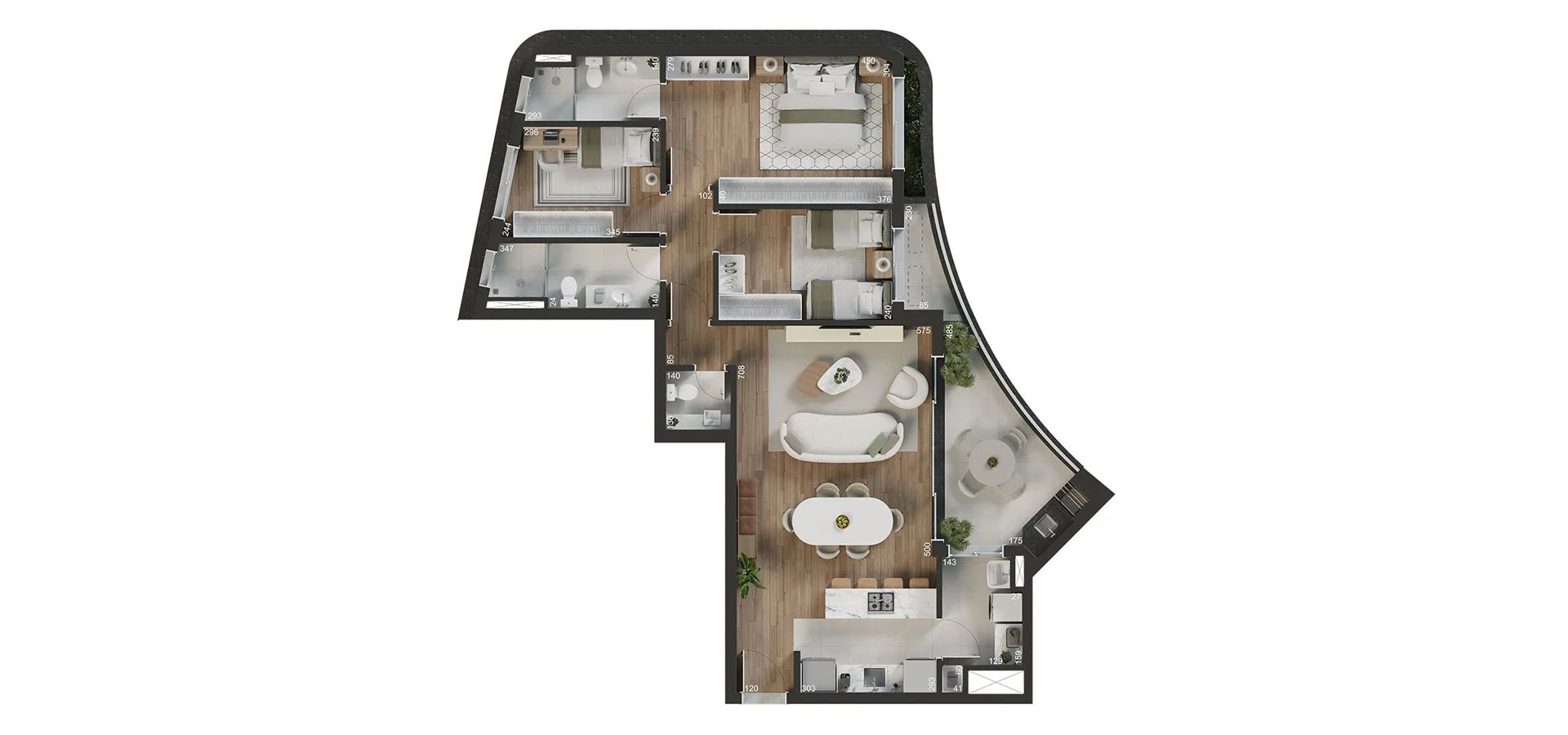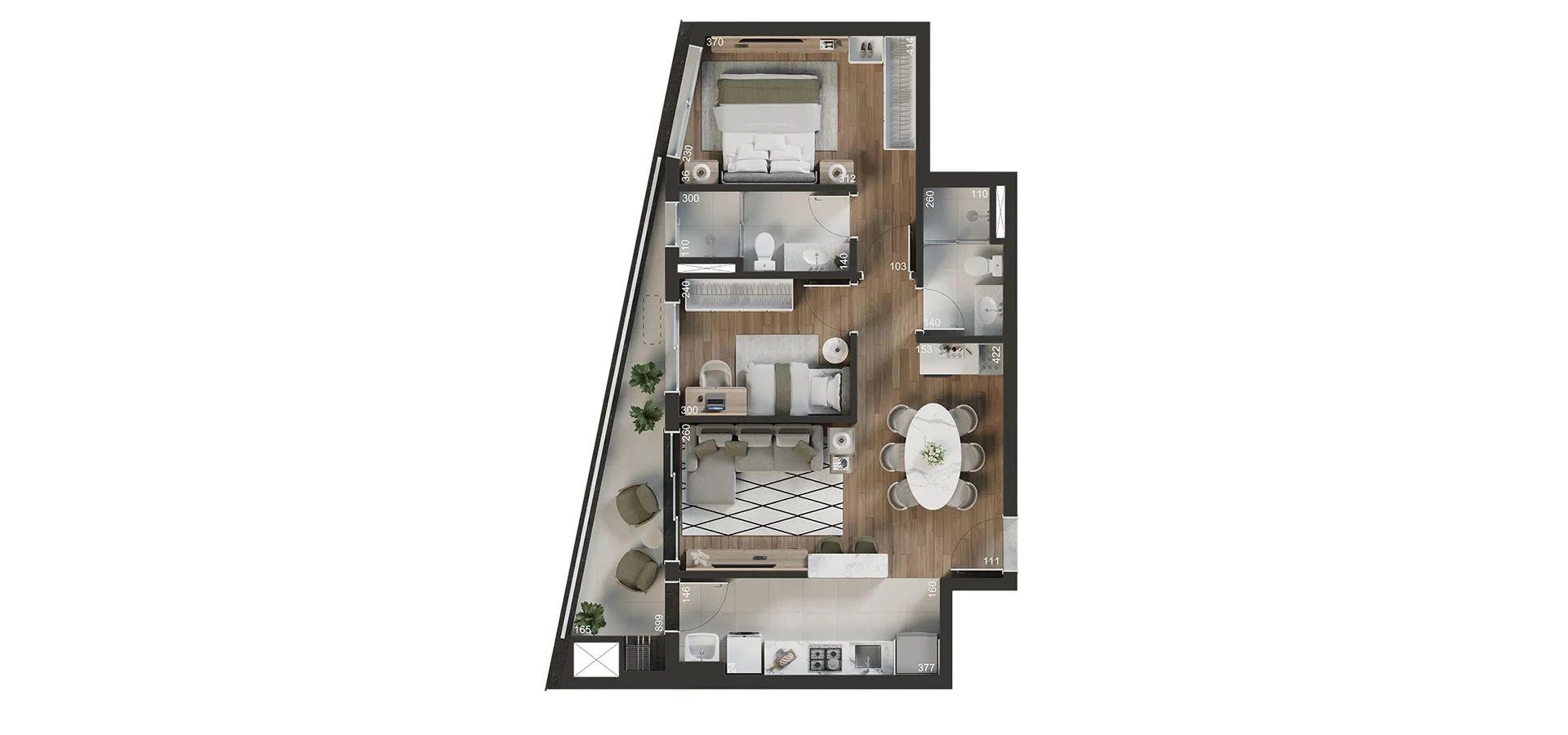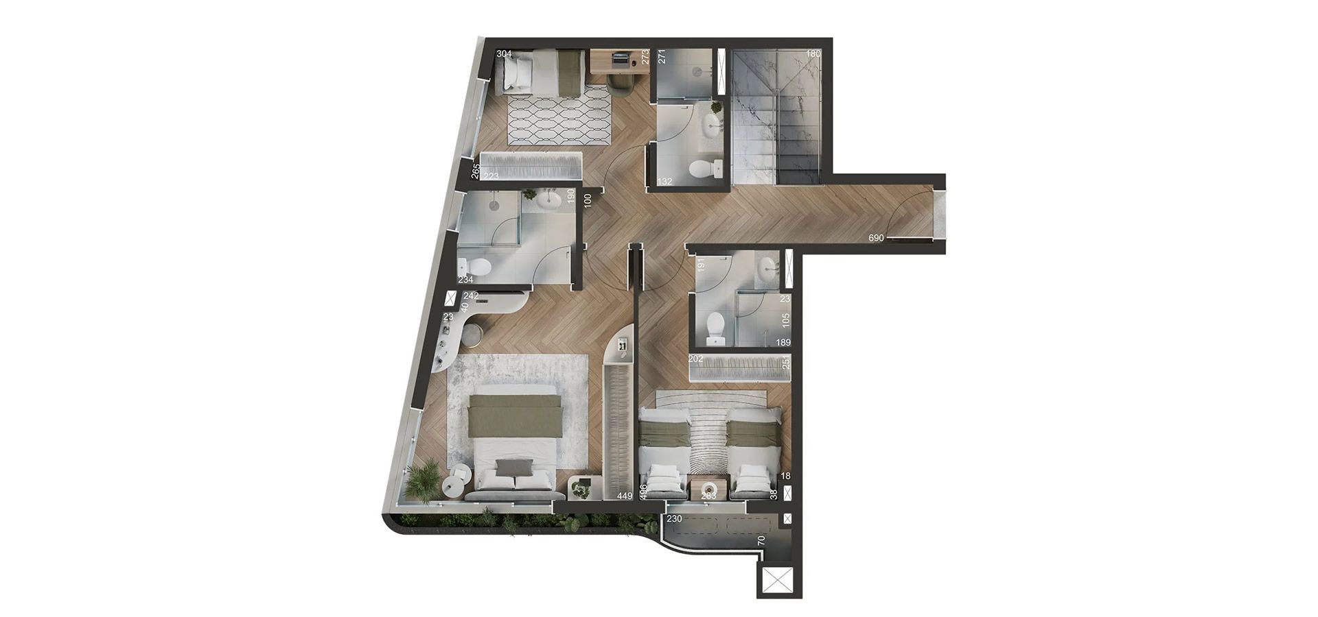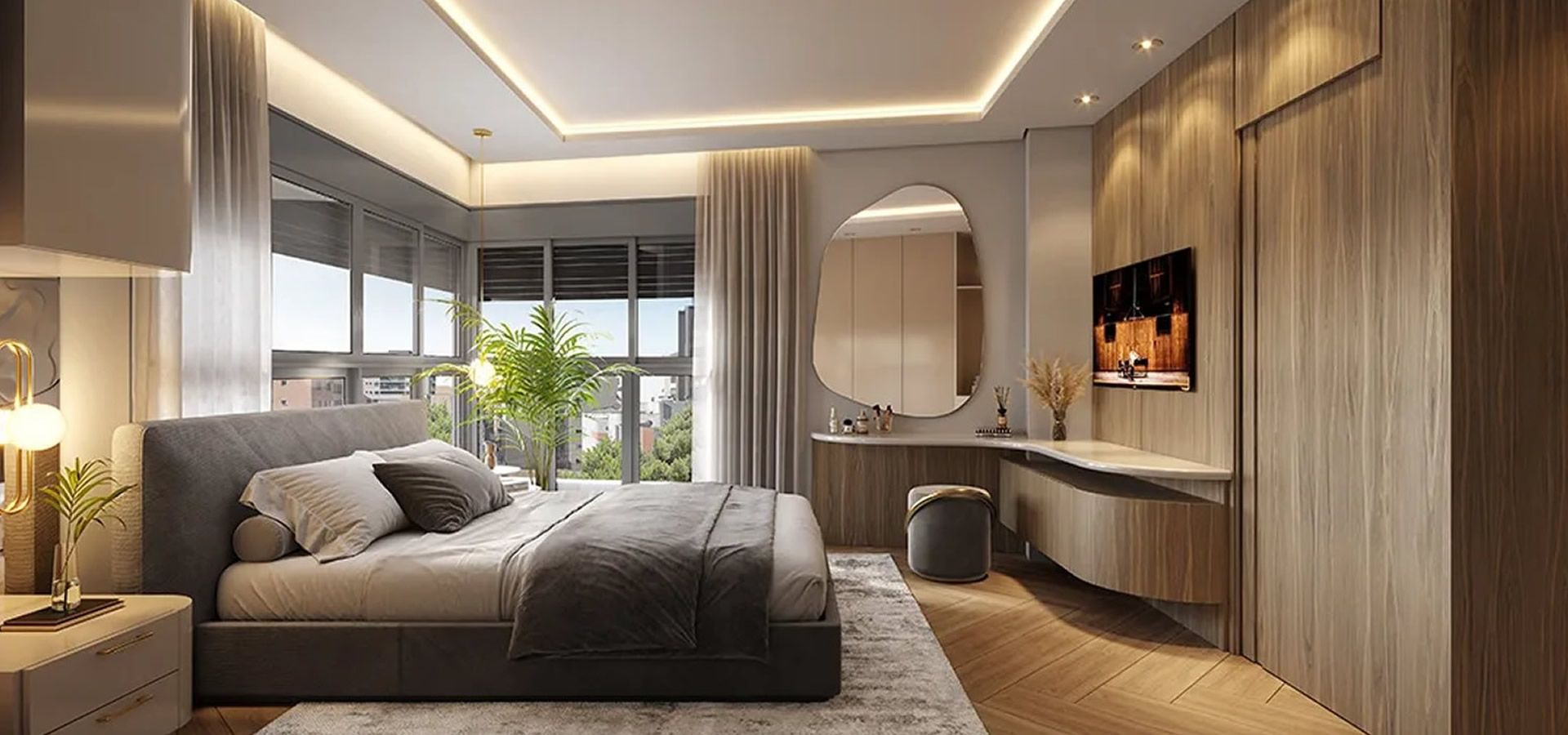 - Persiana integrada motorizada nos quartos.
